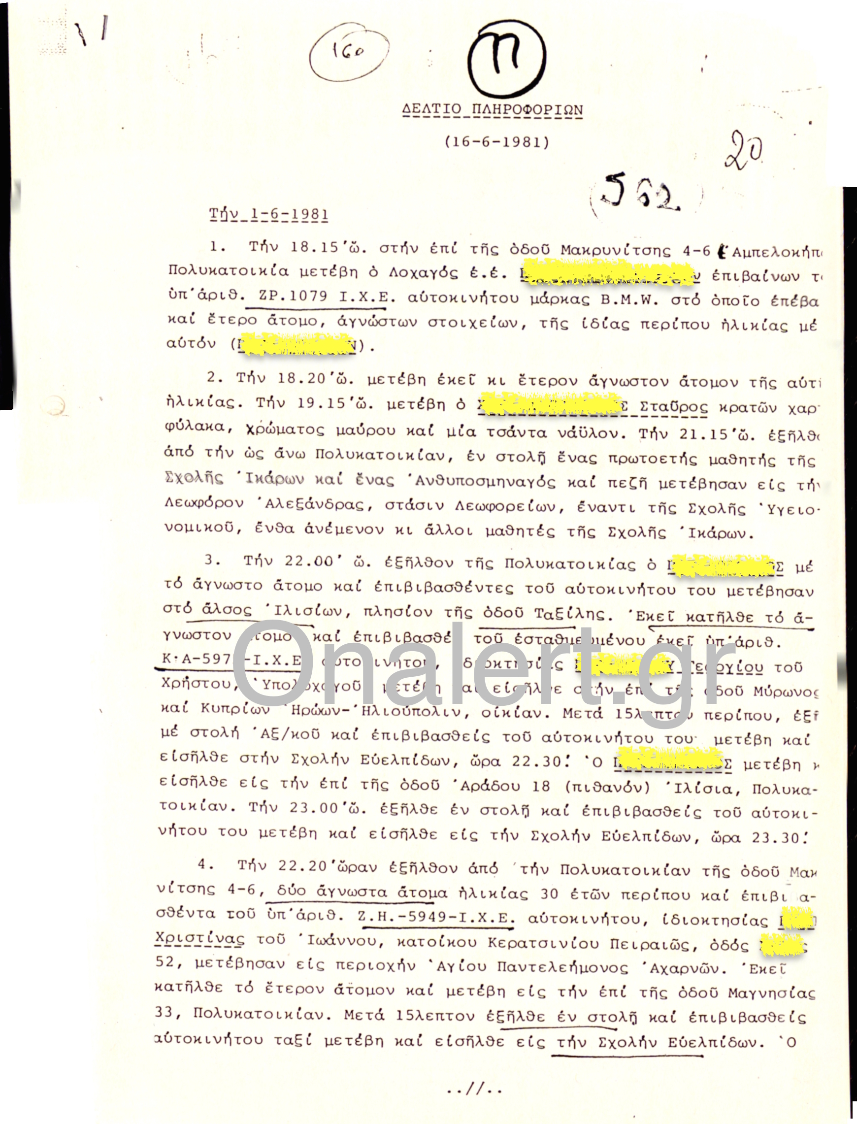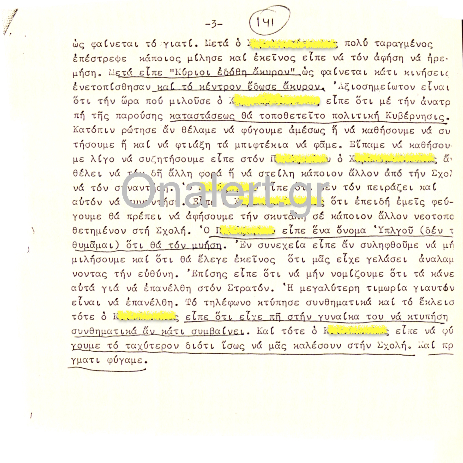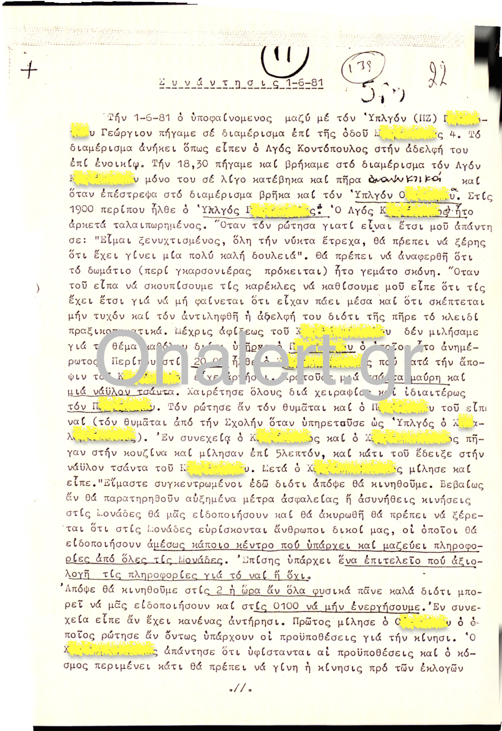 Από τα έγγραφα των παρακολουθήσεων που αποκαλύπει σήμερα το Onalert.gr προκύπτει ότι την 1η Ιουνίου 1981, ομάδα αξιωματικών ήταν έτοιμη να μας…σώσει από τον σοσιαλισμό! Τα όσα αναφέρονται στα έγγραφα προκύπτουν από δύο πηγές. Από εκείνους που παρακολουθούσαν διαμέρισμα στους Αμπελόκηπους απ΄ έξω καταγράφοντας ποιοι μπήκαν,βγήκαν και που πήγαν και από αξιωματικό που βρισκόταν μέσα στο διαμέρισμα και ανέμενε μαζί με άλλους την εντολή “για να κινηθούν”. Τελικά δόθηκε…άκυρο και έφαγαν…μπιφτέκια . Οι συνομιλίες μέσα στο διαμέρισμα έχουν ενδιαφέρον ,όπως μεγάλο ενδιαφέρον έχει η σημασία που έδιναν στην Σχολή Ευελπίδων.