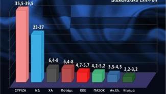 ΣΥΡΙΖΑ 35,5-39,5%, ΝΔ 23-27%, Χρυσή Αυγή 6,4-8% , Ποτάμι 6,4-8%, ΚΚΕ 4,7-5,7%, ΑΝΕΛ 3,5-4,5%, και ΠΑΣΟΚ 4,2-5,2%, ενώ για το ΚΙΔΗΣΟ προέβλεψε ένα ποσοστό μεταξύ 2,2 και 3,2%