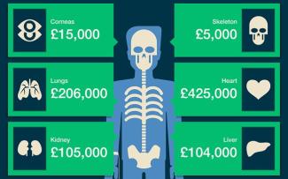 Όπως διαβάζουμε σε αυτό, το ανθρώπινο σώμα είναι αρκετά πολύτιμο: οι κερατοειδείς κοστίζουν περίπου 20.880 ευρώ (το ρεπορτάζ είναι σε Λίρες Αγγλίας), τα πνευμόνια 286.729 ευρώ, ο σκελετός περίπου 7000 ευρώ και η καρδιά 592.000 ευρώ.