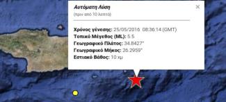 Σύμφωνα με το Γεωδυναμικό Σεισμολογικό Ινστιτούτο, ο σεισμός που σημειώθηκε, είχε ένταση 5.5 Ρίχτερ, επίκεντρο νότια της Κρήτης, ενώ το εστιακό του βάθος μετρήθηκε στα 10 χλμ.