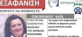 Ώρες αγωνίας για τους συγγενείς της Βάιας Οικονόμου καθώς η 47χρονη καθηγήτρια μαθηματικών από το Κορδελιό Θεσσαλονίκης, αγνοείται για 13η μέρα. Τα ίχνη της χάθηκαν την Παρασκευή 6 Οκτωβρίου, ενώ σύμφωνα με πληροφορίες η αστυνομία δεν αποκλείει το ενδεχόμενο εγκληματικής ενέργειας.