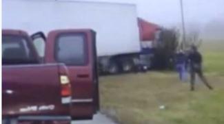 Στο ατύχημα αυτό εμπλέκεται ένα κόκκινο αγροτικό, το οποίο βρίσκεται σταματημένο εμπρός από το περιπολικό στην άκρη του δρόμου. Την ίδια στιγμή προσπαθεί να περάσει από το σημείο μία νταλίκα, η οποία πηγαίνει αργά, προφανώς για να αποφύγει τα εμπόδια.