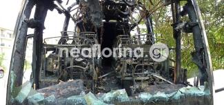 Στις 5 τα ξημερώματα όμως, από άγνωστη μέχρι στιγμής αιτία, ξέσπασε φωτιά που κατέστρεψε το εσωτερικό του λεωφορείου και μεγάλος μέρος της οροφής και του έμπροσθεν χώρου.