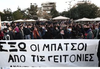 Οι συγκεντρωμένοι κρατούν πανό με συνθήματα όπως «Έξω οι μπάτσοι από τη γειτονιά μας».