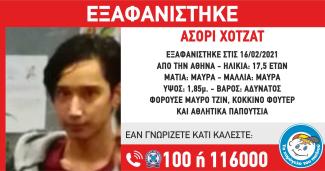 Στις 16/02/2021, στις 12.50, εξαφανίστηκε από την περιοχή της Αθήνας, ο Hojat Ashori 17,5 ετών, αφγανικής καταγωγής. «Το Χαμόγελο του Παιδιού» ενημερώθηκε σήμερα, 17/2/2021, για την εξαφάνιση του ανήλικου και άμεσα προέβη, στη δημοσιοποίηση των στοιχείων του κατόπιν Εισαγγελικής εντολής.