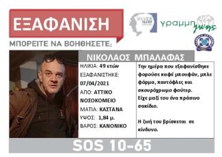 Συναγερμός έχει σημάνει στις Αρχές για την εξαφάνιση 49χρονου από το ΑΤΤΙΚΟ ΝΟΣΟΚΟΜΕΙΟ. Πρόκειται για τον Νικόλαο Μπαλάφα, τα ίχνη του οποίου χάθηκαν στις 7 Αοπριλίου.