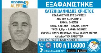 Στις 26/03/2021 ώρα 10:00 π.μ, εξαφανίστηκε από την περιοχή του Ασπροπύργου, ο Χατζηιωαννίδης Χρήστος, 36 ετών. Το «Χαμόγελο του Παιδιού» ενημερώθηκε για την εξαφάνιση του Χατζηιωαννίδη Χρήστου στις 31/03/2021 και προχώρησε άμεσα στη δημοσιοποίηση των στοιχείων του ενήλικου κατόπιν αιτήματος των οικείων του καθώς ενδέχεται να συντρέχουν λόγοι οι οποίοι θέτουν τη ζωή του σε κίνδυνο.