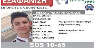 Την εξαφάνιση 20χρονου από τον Βύρωνα Αττικής γνωστοποιεί με ανακοίνωσή της η «Γραμμή Ζωής».