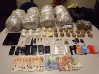Χθες το πρωί πραγματοποιήθηκε οργανωμένη επιχείρηση αστυνομικών της ανωτέρω Υπηρεσίας, κατά την οποία, αφού πραγματοποιήθηκαν έρευνες σε διάφορες περιοχές της Θεσσαλονίκης, κατασχέθηκαν από τις οικίες των παραπάνω αλλά και από την κατοχή τους 10 δέματα κάνναβης και 2 μικροδέματα συνολικού βάρους 9 κιλών και 712 γραμμαρίων, 24 δέματα και 5 μικροδέματα κοκαΐνης συνολικού βάρους 1 κιλού και 275,4 γραμμαρίων, 2 μικροδέματα κατεργασμένης κάνναβης σοκολάτα) συνολικού βάρους 4,9 γραμμαρίων, 24 ναρκωτικά δισκία, 2 γυάλινες πίπες με εμφανή υπολείμματα κοκαΐνης, 1 ξυραφάκι, 1 μεταλλικό αντικείμενο (διανομέας) για χρήση ναρκωτικών ουσιών, 2 ηλεκτρονικές ζυγαριές ακριβείας, 7 κινητά τηλέφωνα και 8 πακέτα σύνδεσης, το χρηματικό ποσό των 1.520 ευρώ, ως προερχόμενο από εμπορία ναρκωτικών ουσιών.