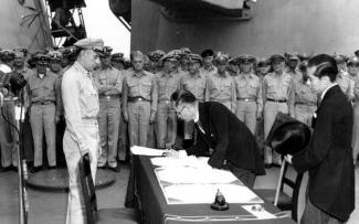 1945: Λήγει ο Β' Παγκόσμιος Πόλεμος με την οριστική και επίσημη παράδοση της Ιαπωνίας. Η επίσημη τελετή λαμβάνει χώρα επί του πολεμικού πλοίου «Μιζούρι» στ' ανοιχτά του κόλπου του Τόκιο.