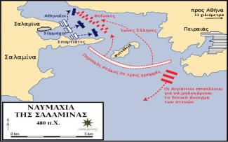 480 π.Χ: Η Ναυμαχία της Σαλαμίνας. Ο ελληνικός στόλος υπό τον Θεμιστοκλή και τον Ευρυβιάδη καταναυμαχεί τον περσικό στόλο στα στενά της Σαλαμίνας. Ο αρχηγός των Περσών, Ξέρξης, παρακολουθεί την τραγωδία του ναυτικού του από το όρος Αιγάλεω. Σύμφωνα με μια εκδοχή η Ναυμαχία έγινε στις 22 Σεπτεμβρίου. Άλλες πηγές αναφέρουν ότι πραγματοποιήθηκε στις 28 ή 29 Σεπτεμβρίου (21-22 Βοηδρομιώνος) του 480 π.Χ. (πηγή φωτογραφίας: Βικιπαίδεια)