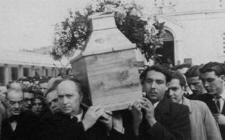 1943: «Ηχήστε σάλπιγγες...» απαγγέλλει ο Άγγελος Σικελιανός στην κηδεία του σπουδαίου Έλληνα ποιητή Κωστή Παλαμά στο Α’ Νεκροταφείο με τη συμμετοχή χιλιάδων κόσμου.