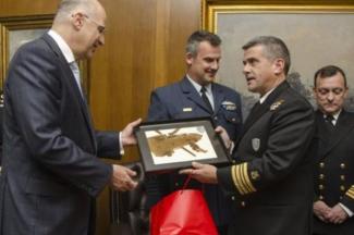 Ο κ. Δένδιας απένειμε το θυρεό του υπουργείου στα μέλη των πληρωμάτων. Παρόντες στη συνάντηση ήταν ο Αρχηγός ΓΕΝ Αντιναύαρχος Ευάγγελος Αποστολάκης ΠΝ και ο Αρχηγός ΓΕΑ Αντιπτέραρχος (Ι) Ευάγγελος Τουρνάς.