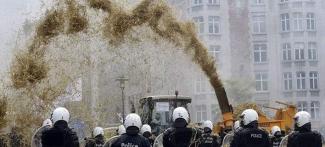 Η αστυνομία απέκλεισε το πρωί το κέντρο της βελγικής πρωτεύουσας, τοποθετώντας αστυνομικές κορδέλες και συρματοπλέγματα και όταν η κατάσταση αγρίεψε έκαναν χρησιμοποίησαν αντλίες νερού εναντίον των αγροτών. Ωστόσο οι τελευταίοι είχαν έτοιμη τη δική τους απάντηση αφού είχαν φέρει μηχάνημα που πετούσε άχυρα!
