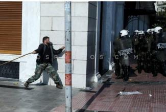 Εκεί ένα αγρότης, φαίνεται σα να έχει στήσει καρτέρι πίσω από τον τοίχο με την κατσούνα του σε μια διμοιρία των ΜΑΤ.