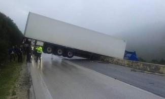Όπως μάλιστα βλέπεστε και από την φωτογραφία, ο τράκτορας της νταλίκας βρέθηκε έξω από το προστατευτικό τοιχίο και κρέμονταν στον αέρα! Στο σημείο έσπευσαν δυνάμεις της τροχαίας και της πυροσβεστικής ενώ χρειάστηκε να κλείσει για αρκετή ώρα η Εθνική Οδός, μέχρι να απομακρυνθεί η νταλίκα. Ευτυχώς ο οδηγός του οχήματος δεν τραυματίστηκε.
