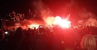 Παρά το προχωρημένο της ώρας, όλη η Θεσσαλονίκη είναι στο πόδι για να υποδεχθεί τους παίκτες των «ασπρόμαυρων», που απολαμβάνουν την κάθε στιγμή, παρέα με το τρόπαιο του Κυπέλλου Ελλάδος.