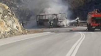 Το συγκεκριμένο λεωφορείο, που υπέστη σοβαρότατες ζημιές, μετεφερε Aλβανούς που ξεκίνησαν από Τίρανα και πήγαινα στην Αθήνα και, από άγνωστο μέχρι στιγμής λόγο, έπιασε φωτιά.