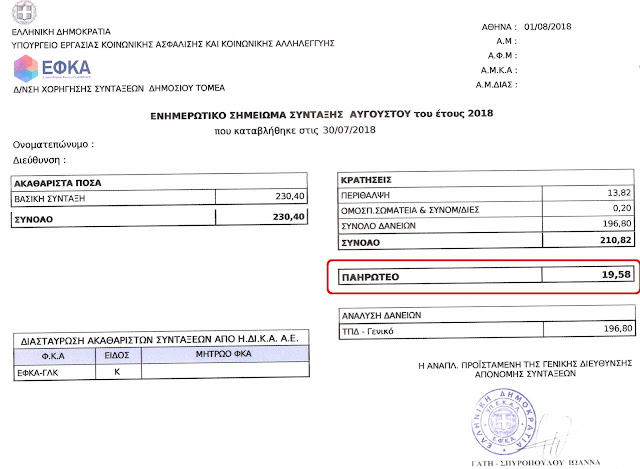 Δυστυχώς και χωρίς καμία ειδοποίηση είδε στην πληρωμή του Αυγούστου να τις κατατίθεται, όπως φαίνεται και στην εικόνα, μόλις 19,58 ευρώ αντί για 216,58 ευρώ. Το ΤΠΔ πήρε από τη σύνταξη των 216,58 ευρώ, με το έτσι θέλω, τα 196,80 ευρώ. Χρειάστηκαν 34 τηλεφωνήματα σε ΕΦΚΑ, ΓΛΚ, ΤΠΔ για να μάθει τελικά από που προέρχεται η κράτηση αυτή. Πως χαρακτηρίζεται αυτό;