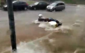 Κάμερα κατέγραψε καρέ - καρέ την παράσυρση διανομέα από τα νερά, που λόγω της ισχυρής βροχόπτωσης, μετέτρεψαν σε ποτάμι την οδό Λαγκαδά.