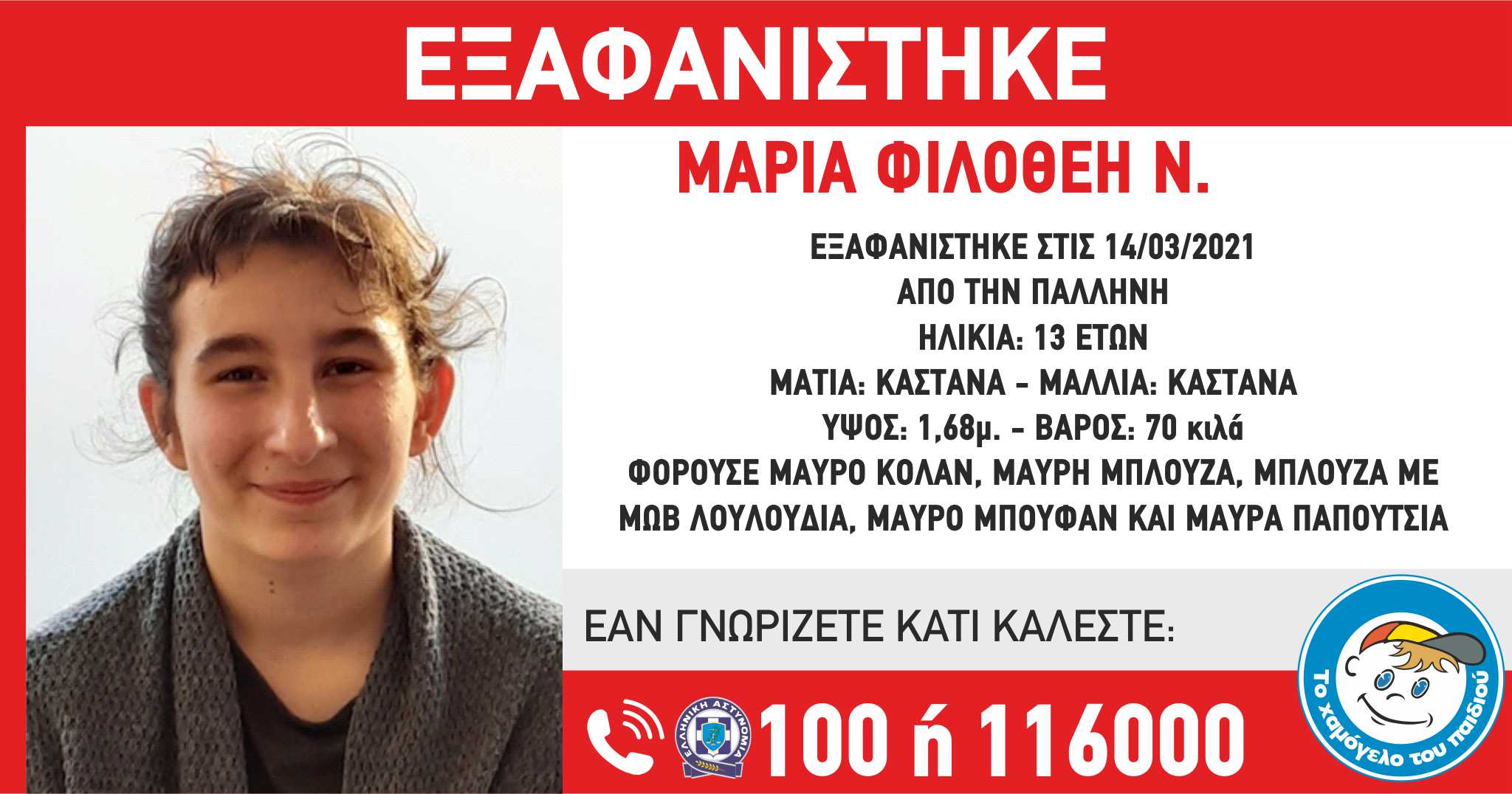 Στις 11/03/2021, εξαφανίστηκε από την περιοχή της Παλλήνης, η Μαρία-Φιλοθέη Ν. 13 ετών. «Το Χαμόγελο του Παιδιού» ενημερώθηκε εχτές, 14/3/2021, για την εξαφάνιση της ανήλικης και άμεσα προέβη στη δημοσιοποίηση των στοιχείων της κατόπιν Εισαγγελικής εντολής, καθώς συντρέχουν σοβαροί λόγοι οι οποίοι θέτουν την ζωή της σε κίνδυνο.