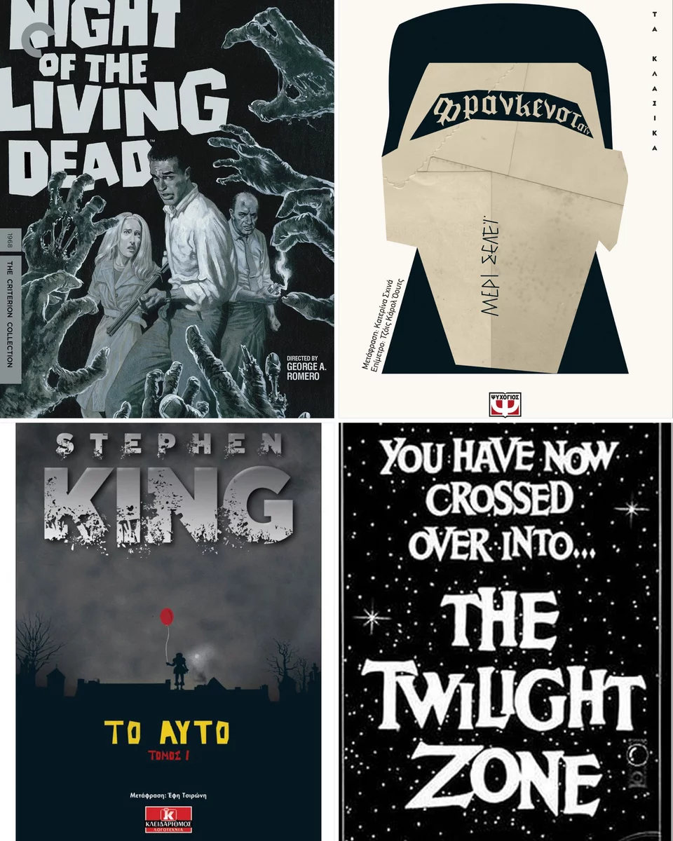 Ξεκινώ με τις ταινίες: Πρώτο και καλύτερο το «The night of the living dead» (1968), του πατέρα των ταινιών ζόμπι, George Romero. H ατάκα του Johnny «They’re coming to get you, Barbara», μου παγώνει πάντα το αίμα. Χρονολογικά συνεχίζοντας θα έλεγα το «The exorcist» (1973), του William Friedkin. Μπορεί η πρωταγωνίστριά του, Linda Blair, να μην έκανε και σπουδαία πράγματα μετά από αυτή την ταινία, όμως «το κοριτσάκι απ’ τον εξορκιστή» έχει μείνει στη μνήμη μας και στην ιστορία των ταινιών του είδους. Τρίτη χρονολογικά και χωρίς διάθεση αξιολόγησης «The shining» (1980) του Stanley Kubrick. Η μεταφορά στη μεγάλη οθόνη του ομώνυμου βιβλίου του Stephen King, που μας έκανε να βλέπουμε -για χρόνια- με άλλο μάτι τα ορεινά ξενοδοχεία τον χειμώνα.