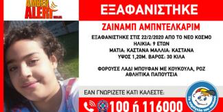 Το «Χαμόγελο του Παιδιού» ενημερώθηκε για την εξαφάνιση της ανήλικης, σήμερα, απογευματινές ώρες και προχώρησε άμεσα στην ενεργοποίηση του μηχανισμού AMBER ALERT HELLAS, κατόπιν εντολής της Εισαγγελίας Ανηλίκων Αθηνών. Η Zainab Abdelkarym έχει κοντά σγουρά καστανά μαλλιά, καστανά μάτια, ύψος 1.20μ και ζυγίζει 30 κιλά. Την ημέρα που εξαφανίστηκε φορούσε λαδί μπουφάν με κουκούλα και ροζ αθλητικά παπούτσια.