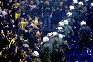 Για περίπου τέσσερα λεπτά έπεσε ξύλο μεταξύ των οπαδών και των ΜΑΤ, αλλά η κατάσταση δεν ξέφυγε και τα πνεύματα ηρέμησαν...