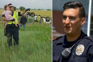 Εκείνη τη στιγμή κάποιος περαστικός τραβάει τη φωτογραφία που συγκίνησε την Αμερική: ο αστυνομικός έχει αγκαλιά το κορίτσι ενώ στο φόντο υπάρχει αναποδογυρισμένο το οικογενειακό SUV ενώ πιο πέρα ένας άλλος αστυνομικός περιποιείται έναν άλλο επιβάτη.