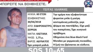 Ο άτυχος 60χρονος, είχε εξαφανισθεί την 30.06.2018, από το σπίτι του στο Σιδηρόκαστρο, όταν έφυγε με το αυτοκίνητό του. Έκτοτε δεν είχε δώσει σημεία ζωής. Η ΓΡΑΜΜΗ ΖΩΗΣ, μετά από αίτημα των οικείων του και με τη συγκέντρωση των απαραίτητων δικαιολογητικών, εξέδωσε SILVER ALERT για την κινητοποίηση όλων για την ανεύρεσή του.