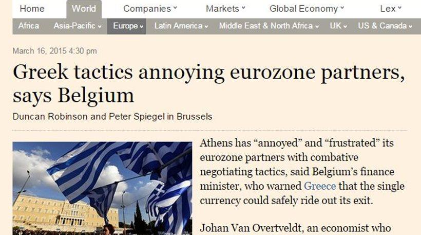 Τετάρτη, 18 Μαρτίου, 2015 Μήνυμα στην Αθήνα ότι έχει «ενοχλήσει» και «εξοργίσει» τους ευρωπαίους εταίρους της με τις μαχητικές διαπραγματευτικές της