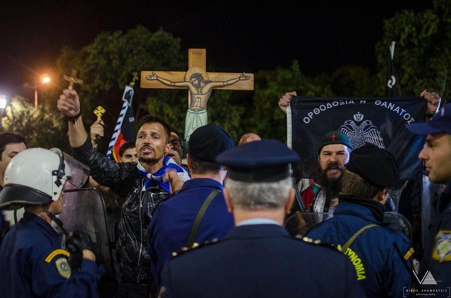 Κρατώντας πανό και ελληνικές σημαίες στα χέρια, περίπου 50 διαδηλωτές πραγματοποίησαν...