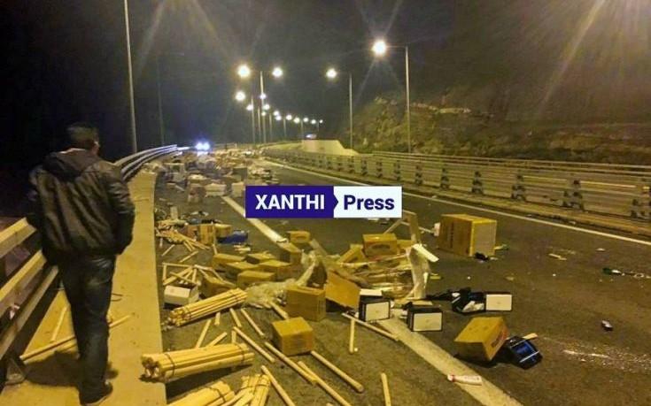 Με εμπορεύματα γέμισε η Εγνατία Οδός στο ύψος της Ν. Καρβάλης Καβάλας μετά από ένα πρωτόγνωρο ατύχημα