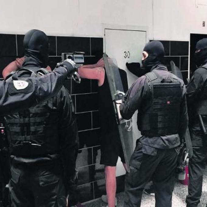 Με τους περίπου 70 υποστηρικτές της Χρυσής Αυγής να στέκονται προσοχή κατά την είσοδο του αρχηγού τους στη δικαστική αίθουσα