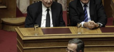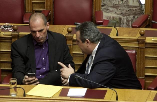 Το φωτογραφικό στιγμιότυπο από τα κυβερνητικά έδρανα στην Βουλή δείχνουν τον ΥΕΘΑ Πάνο Καμμένο να συνομιλεί με τον σωστό